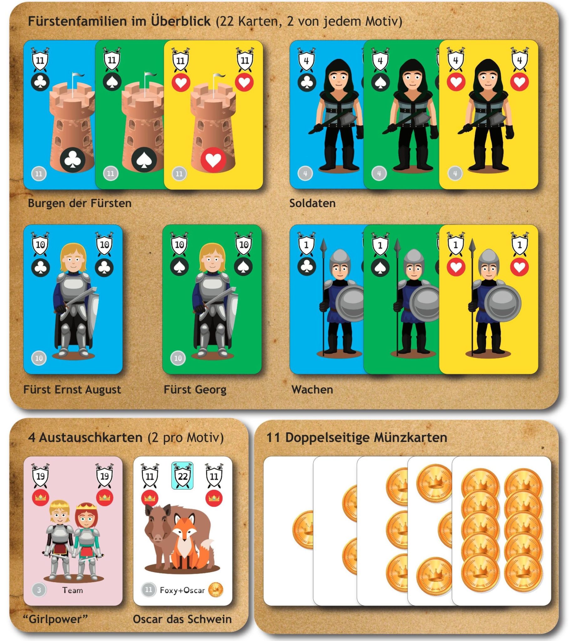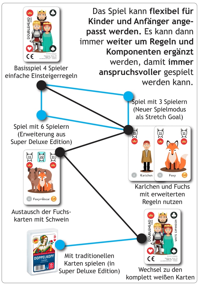 Spielprinzip: Spieler legen Karten in spannenden Kartenstichduellen und spielen dabei in wechselnden Zweierteams zusammen. Jeder Spieler muss durch den geschickten Einsatz seiner Karten Silbermünzen erbeuten. Wer die meisten Silbermünzen erbeutet, „Füchse“ der Gegner einfängt oder mutig sein „Karlchen“ spielt, gewinnt goldene Siegpunkte. Wer zuerst eine vorher festgelegte Anzahl von goldenen Siegpunkten erspielt hat, gewinnt das Spiel.
